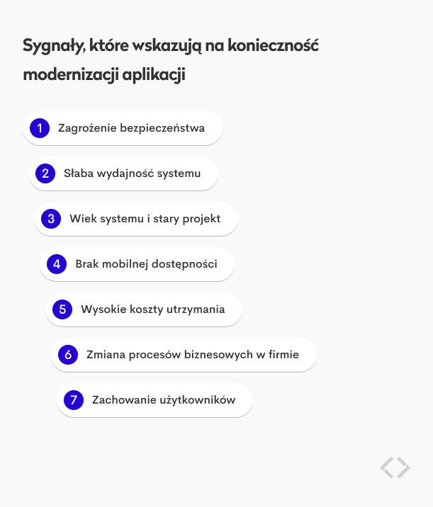 Jakie sygnały świadczą o tym, że aplikacja nie dotrzymuje kroku zmianom technologicznym, więc czas na modernizację systemu? Poniżej znajdziesz główne powody modernizacji aplikacji internetowych.