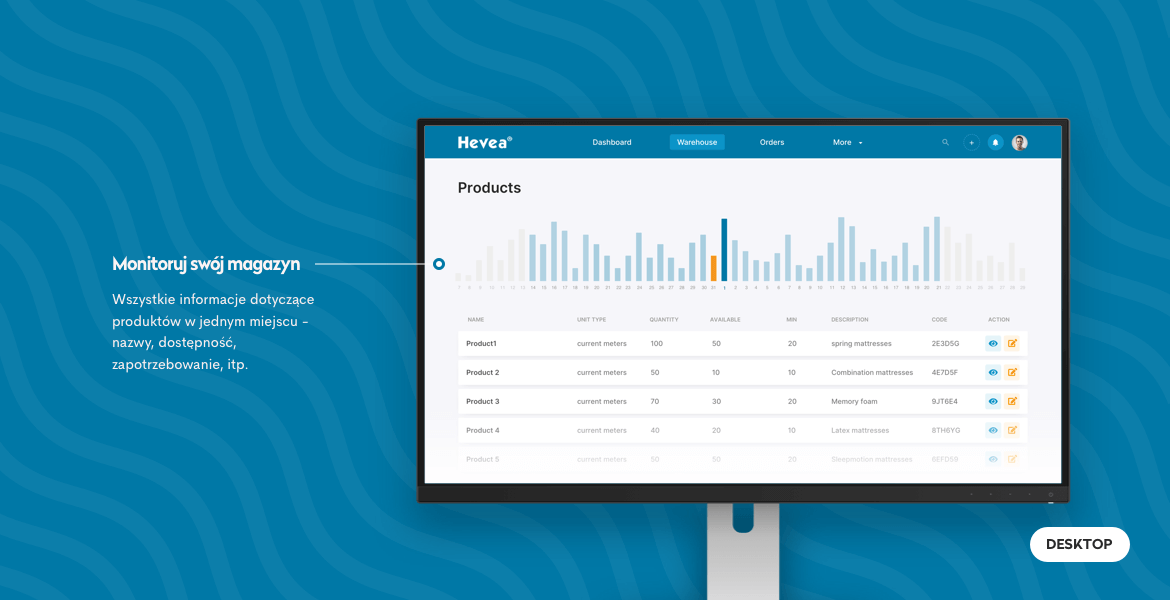 Desktopowa wersja aplikacji stworzonej dla Hevei jako projekt w zakresie transformacji cyfrowej.Bardzo szybko przeszliśmy do działania i stworzyliśmy funkcjonalną aplikację webową, pozwalającą na bieżąco sprawdzać stany magazynowe oraz zarządzać całym procesem wysyłki. Dzięki temu można łatwo sprawdzić, na kiedy ma być przygotowane konkretne zamówienie i jakie materiały są potrzebne do jego realizacji. Przenieśliśmy firmę do chmury, dbając o każdy etap takiej drogi i zapewniając sukcesywną migrację. To jeden z wielu przykładów pokazujących, jak przy użyciu odpowiednich metod można zintegrować wszystkie procesy w jednym narzędziu i zwiększyć satysfakcję klientów.